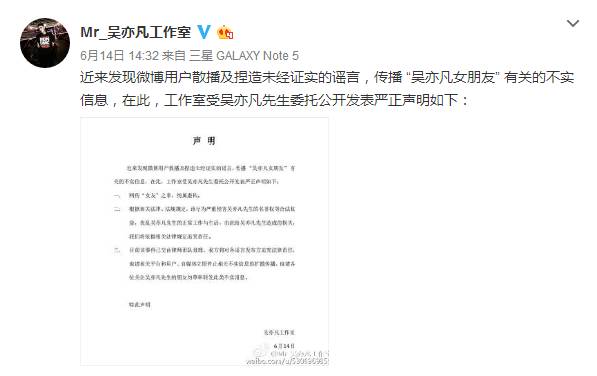 吴亦凡工作室随即做出快速反应,直指网传女友纯属虚构,并严正声明将对各造谣发布方追究法律责任。