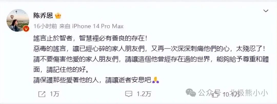 乔任梁最好的朋友陈乔恩也站出来为其发声,呼吁停止传播谣言: