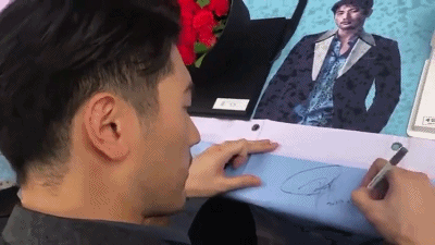 身高195cm的他,在大雨天里蹲着,给粉丝签名。