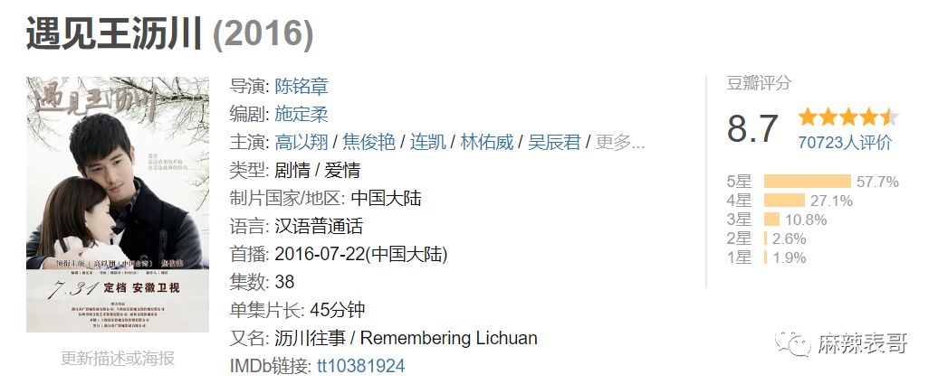 2016年,《遇见王沥川》播出,豆瓣至今评分高达8.7分,从此以后,他不再是高以翔,也是人人都难以“move on”的王沥川。