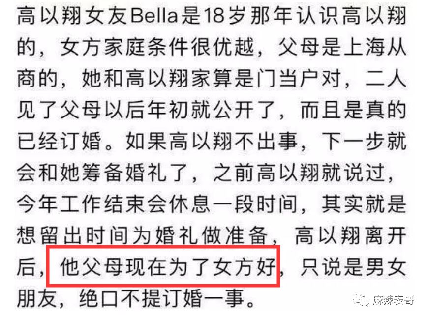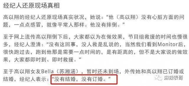 高以翔经纪人对媒体说,高以翔并没有和Bella订婚,否认高以翔有个未婚妻。