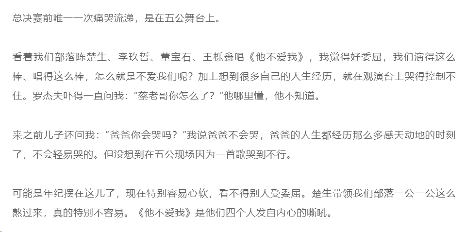 还有那个被蔡国庆说“是他们四个人发自内心的嘶吼”的《他不爱我》舞台,四个人唱出了四种劲儿,可核心是:陈楚生会带着他们熬过去。
