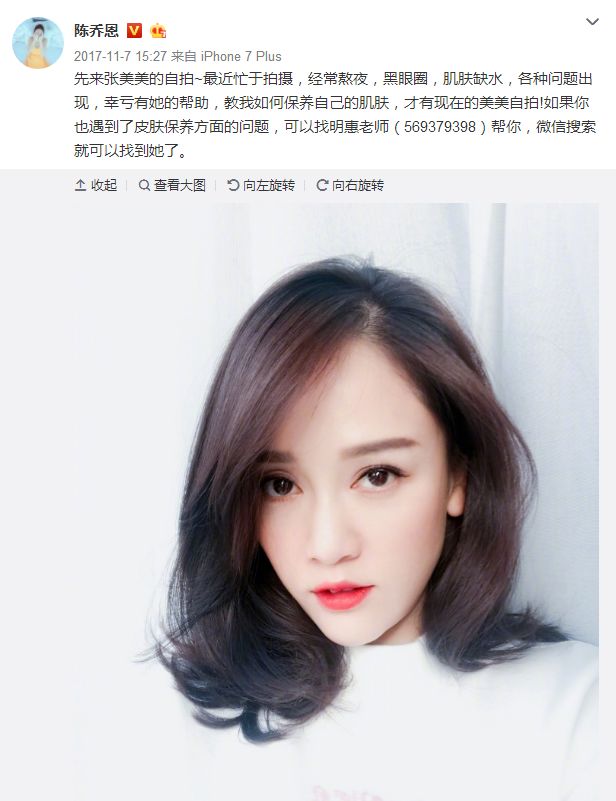 而且陈乔恩的颜值是没话说的,肤白貌美,特别是那吹弹可破的肌肤,真的让人好羡慕,就像她在微博分享的护肤秘笈,大家可以参考一下。