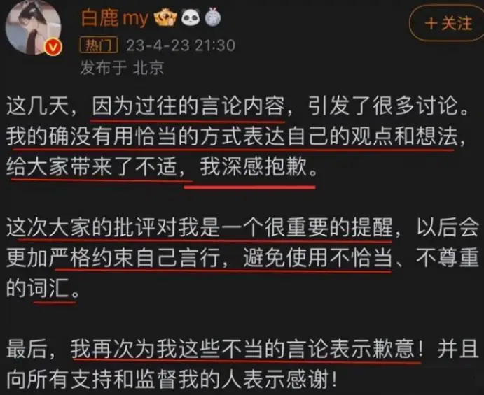 2023年4月,白鹿早年的采访言论被爆出:她用“小母狗才娘”形容女性、多次在节目上自称“男嘉宾”“男的”“男朋友”。