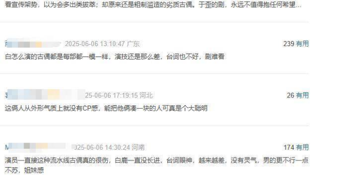 作为这部戏的主角,网友评价白鹿:“一直没有长进,台词眼神,越来越差,没有灵气。”
