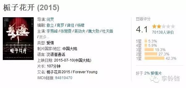 可是要注意的是,《栀子花开》口碑低于《小时代》,只有4.1分,并且票房断崖式跳水,首周票房过3亿,之后放映的半个月加起来不到0.8亿。