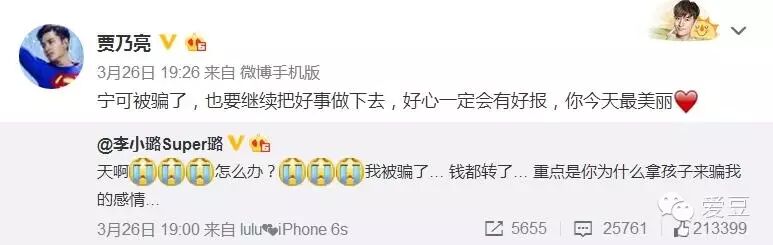 3月26日,李小璐在微博发文表示自己遭遇网络诈骗,:“天啊,怎么办?我被骗了…钱都转了…重点是你为什么拿孩子来欺骗我的感情…”随后,贾乃亮发微博安慰受骗的妻子,称”“宁可被骗了,也要继续把好事做下去,好心一定会有好报,你今天最美丽。”