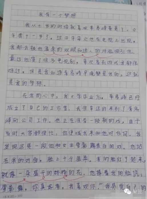 近日,有网友晒出一篇小学生向李易峰表白的作文《我有一个梦想》,在文中小学生“雪儿”写到自己从7岁就开始谢欢李易峰,喜欢了四年,一直坚信李易峰早晚都是自己的,并幻想自己大学毕业后进入了李易峰工作室工作,和李易峰一起对戏,日久生情,最后被李易峰求婚!