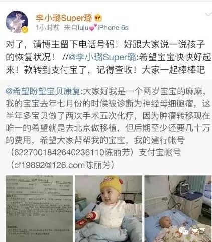 3月26日下午六点左右,李小璐转发了一个名为“希望盼望宝贝健康”的求助微博,该PO主自称是一个两岁宝宝的麻麻,并晒出宝宝的照片和一张症断报告,向网友们求助捐款!