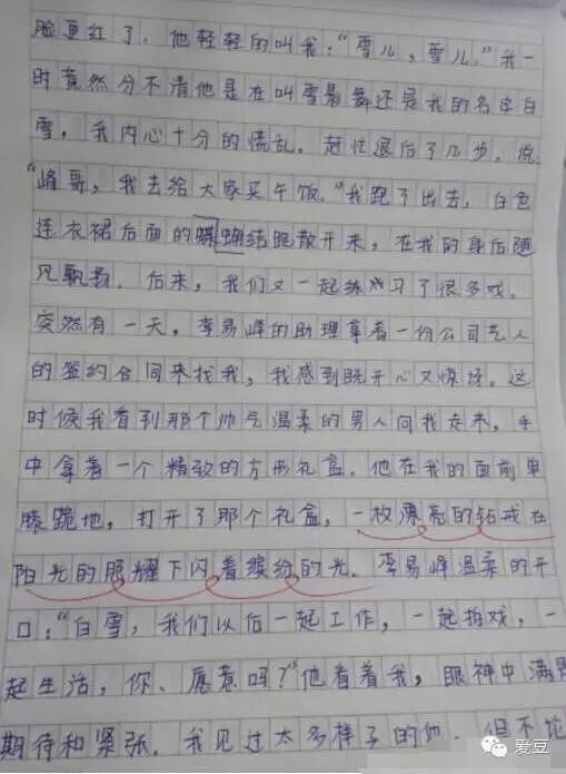 虽然字迹稚嫩,但通篇都洋溢着一股浓浓的玛丽苏味儿,比如“7岁就喜欢李易峰哥哥了”、“每次看到吻戏我都很难过,但是我知道李易峰早晚都是我的,这就是我的梦想”、“他捧着我的脸说:‘雪影舞,你真好看,我喜欢你。’”、“我跑了出去,白色连衣裙后面的蝴蝶结跑散开来,在我的身后随风飘扬。”……梦想就是和我的峰峰一起走到最后”