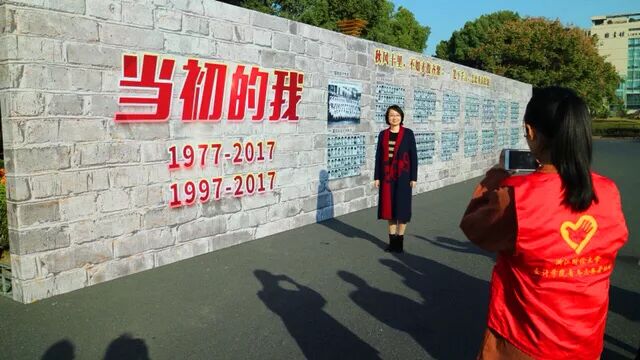 在一面“当初的我”的照片墙前,许多校友停下了脚步。照片墙上印着一张张他们学生时代的照片,这些照片承载了太多的故事与往昔,也印染着太多不舍与回忆。