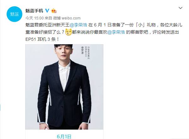 不久前,魅族魅蓝Note3以及魅蓝3的其余版本已经在工信部正式亮相。而今,魅族终于也坐不住要再继续开演唱会顺便发一两部手机了。今天,魅蓝手机公布了魅蓝新品发布会的宣传海报。魅蓝君委托亚洲新天王@李荣浩 在 6 月 1 日准备了一份「小」礼物,各位大龄儿童准备好接招了么?都来说说你最喜欢@李荣浩 的哪首歌吧。