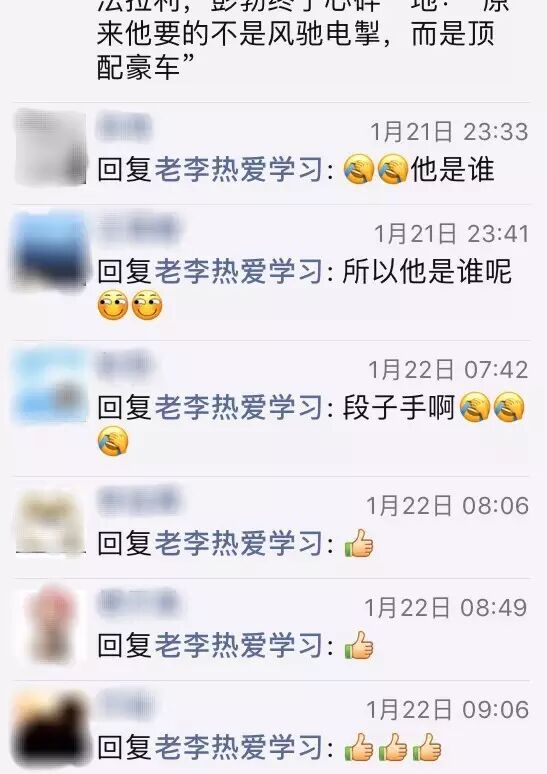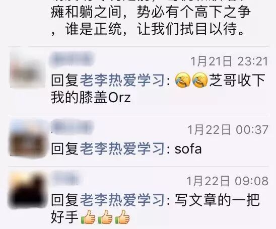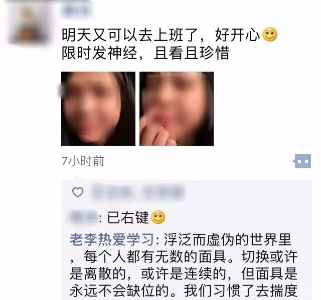 “我把每条朋友圈当作是材料作文的题目,认真的审题,充分调动脑海里积累的作文素材,从命题人的角度揣度这则材料的考点,综合考量各种素材之间的高低错落,合理布局,引人入胜,做到虎头豹尾,熊腰凤翅,拿下高分。