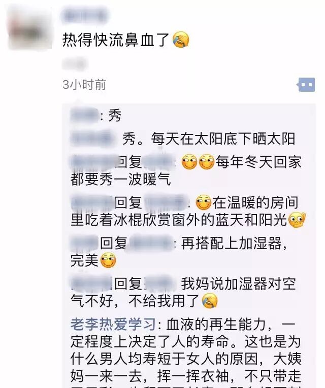 血液的再生能力,一定程度上决定了人的寿命。这也是为什么男人均寿短于女人的原因,大姨妈一来一去,挥一挥衣袖,不只带走了云彩,也留下了长寿。那么想要刺激自身的造血功能,男性朋友没有这个天赋,除了食补和运动以外,便只能求助于主动放血了,故而他们勇敢的闯进沙滩,到比基尼泛滥最严重的地方去,去流血,流鼻血。于是女性的寿命优势骤减,这时出现了一位勇士小曲,她不顾个人安危,誓要将均寿在提高万分之一个百分点,她穿最后的羽绒服吃最老的参,开最热的空调饮最烈的酒,终于鼻腔一股暖流,汩汩赤泉源源不断,带着人均寿命统计表上的数字,一同窜上了天。为她的伟大,致敬!