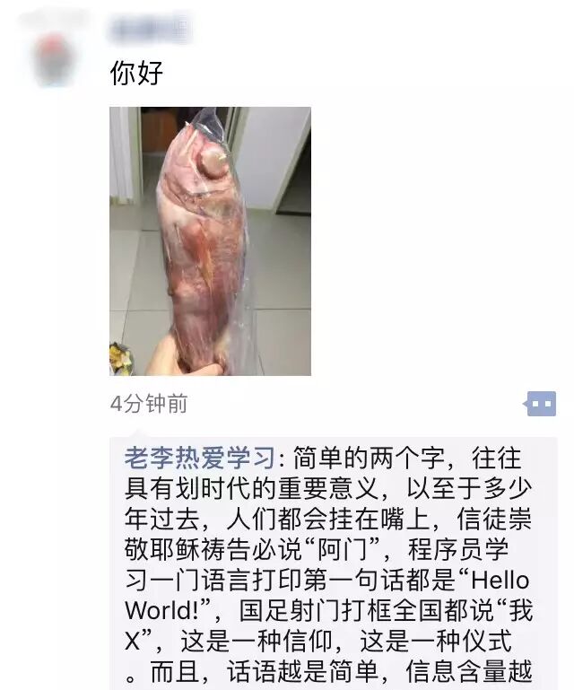 简单的两个字,往往具有划时代的重要意义,以至于多少年过去,人们都会挂在嘴上,信徒崇敬耶稣祷告必说“阿门”,程序员学习一门语言打印第一句话都是“Hello World!”,国足射门打框全国都说“我X”,这是一种信仰,这是一种仪式。而且,话语越是简单,信息含量越高,由于是书面化的文字,缺少了表情和语气,那么这里的“你好”二字熵值更是爆表,让人忍不住去猜测,是这位同志开发了中文编程语言所进行的测试?还是她的孩子刚刚学会了使用微信而发出了惊世骇俗的第一声问候?是她旁敲侧击隔空喊话给男票的警示?还是简单的冒泡证明自己还活着?欢迎继续收看今天的《走近科学》栏目。