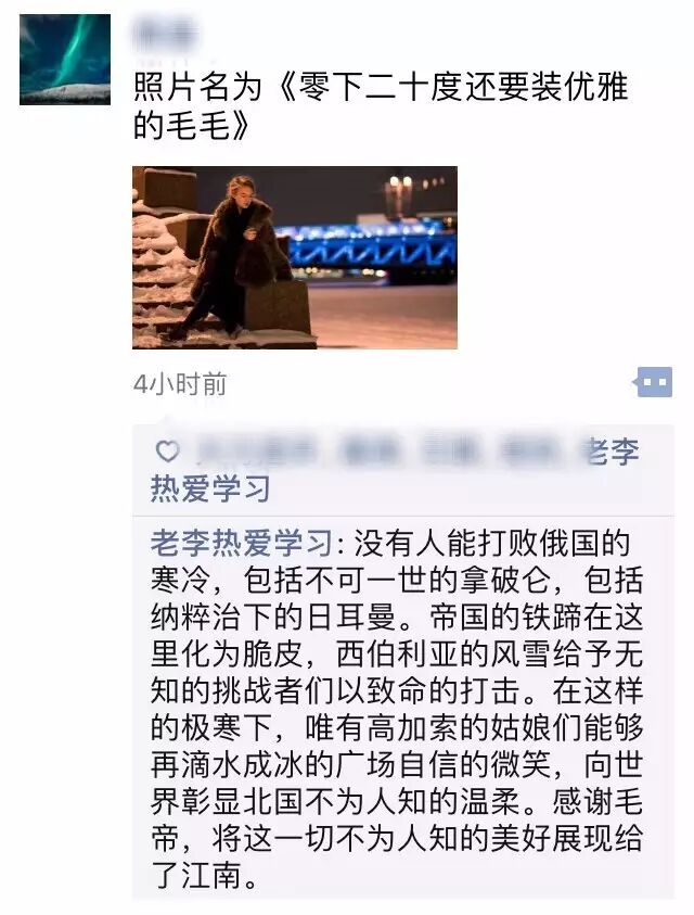 没有人能打败俄国的寒冷,包括不可一世的拿破仑,包括纳粹治下的日耳曼。帝国的铁蹄在这里化为脆皮,西伯利亚的风雪给予无知的挑战者们以致命的打击。在这样的极寒下,唯有高加索的姑娘们能够再滴水成冰的广场自信的微笑,向世界彰显北国不为人知的温柔。感谢毛帝,将这一切不为人知的美好展现给了江南。