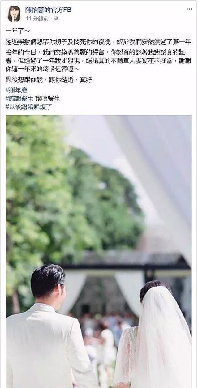 经历了几段真真假假的恋情后,陈怡蓉终于找到了自己的幸福。去年,陈怡蓉在结婚满一周年的时候,还留言秀恩爱。