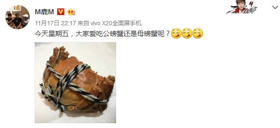 鹿哥问你们是喜欢吃公螃蟹还是母螃蟹呢?然而有鹿饭发出这样子的图片。小编貌似秒懂了,你这胃口真是大,想吃鹿晗这只公螃蟹,哈哈哈,是真的吗?