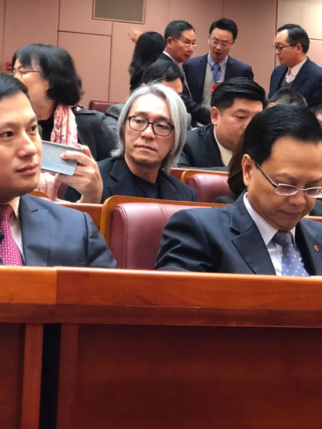 会议开始后,周星驰严肃认真地坐在会场中后方区域,在举手表决环节依然成为各路摄影记者的聚焦点。