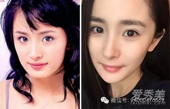 杨幂天生眼睛又大又圆,不过眼距有点宽,杨幂今昔对比照似乎眼距变小了,双眼皮也更深了,眼睛更接近勾人的桃花眼,就连脸型也变小了。