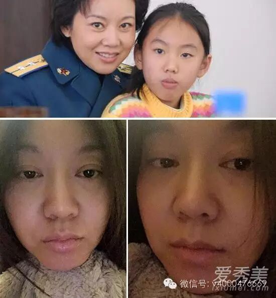 上图是闫妮与女儿的合影,闫妮的女儿和妈妈一样是单眼皮,不知道女儿长大后会不会割双眼皮呢?下图是闫妮素颜照,双眼皮的痕迹很明显,眼皮有些浮肿了。