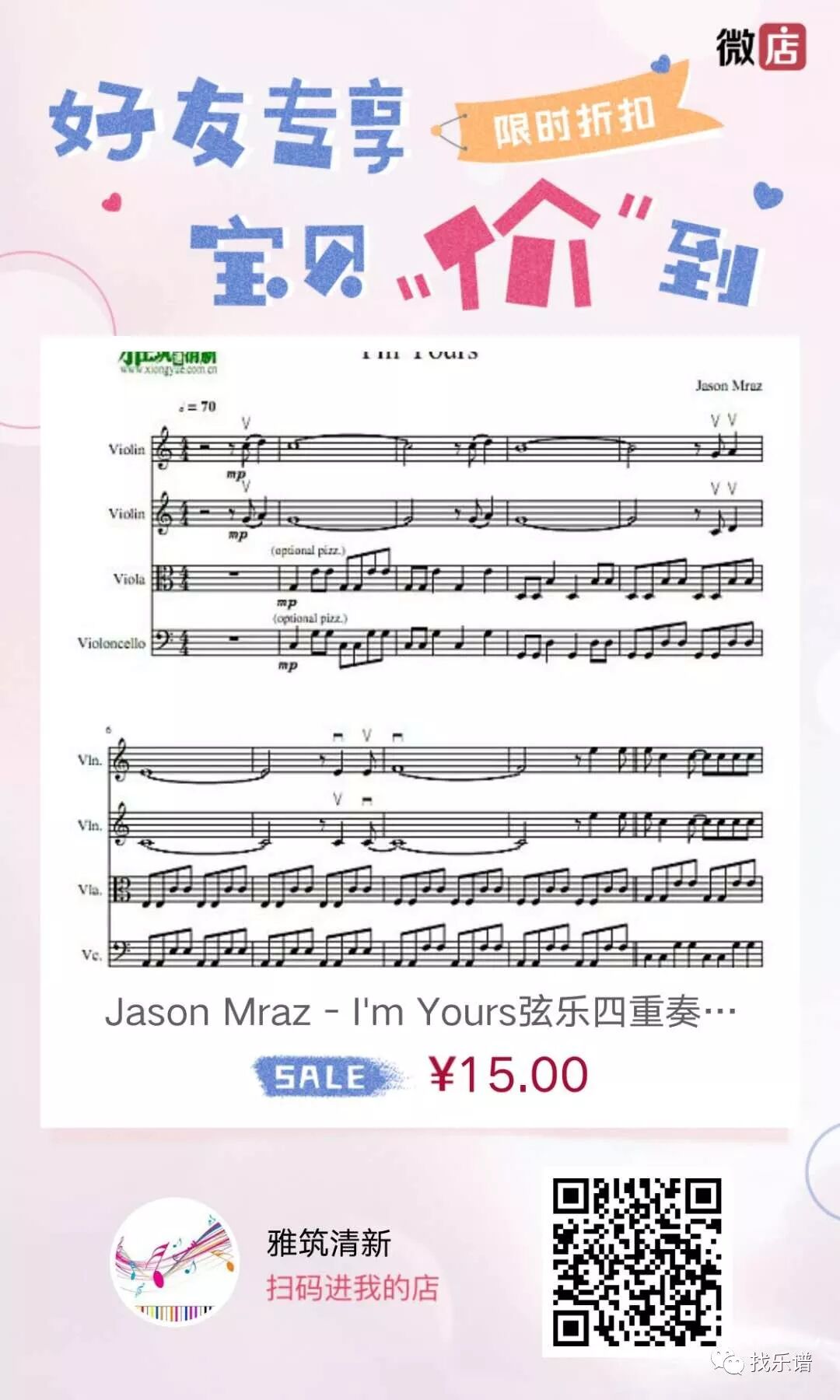 Jason Mraz - I'm Yours弦乐四重奏谱 Z18032304 找乐谱 欧美男星 2018-03-23 23:10:26 1292 创作不易,用心坚持,欢迎请BaGua喝几杯爱心咖啡!打赏并支持本文 打赏并删除本文 加微信“wuaiyazhu”购买此乐谱扫描或长按识别上方二维码购买此乐谱机智的监狱生活 Bravo my life钢琴谱 Z180110012018-02-10EXO - UNIVERSE小提琴谱 Z180110022018-02-09马戏之王Never Enough 钢琴谱 Z180209012018-02-09Michael Kobrin - Roads吉他谱 Z180209022018-02-09苍井翔太 A.I钢琴谱 Z180209032018-02-092CELLOS Shostakovich: Prelude肖斯塔科维奇前奏曲大提琴钢琴谱2018-02-07李闰珉 - Silver Line Z180107012018-02-02It don't mean a thing SSA三声部合唱谱钢琴伴奏谱 Z180201012018-02-02Kelly Valleau - Paris指弹吉他谱 Z180202012018-01-31EXO - Electric Kiss钢琴谱 Z180131022018-01-31我不是机器人 心里的话 Words Of Your Heart钢琴谱 Z180131032018-01-31张艺兴 圣诞又至钢琴谱 Z180131012018-01-31Kelly Valleau 贝多芬第5交响曲第一乐章指弹吉他谱 Z18013001点击阅读原文欣赏更多精彩内容 创作不易,用心坚持,欢迎请BaGua喝几杯爱心咖啡!打赏并支持本文 打赏并删除本文 感谢您的支持鼓励,我会继续努力的!文章地址:用户邮箱:打赏金额:USDT 请输入数字点击”去打赏“,即可进行打赏支持本文章哦 Jason Mraz About the Author 找乐谱 功能介绍:乐谱,弹奏视频 Related Posts despacito 小提琴二重奏谱 Z19020602 2019-02-07 07:30:48 Yiruma 李闰珉 - Ending A Short Piece钢琴谱 Z19020607 2019-02-07 07:30:48 Yiruma -从窗口看到的风景钢琴谱 Z19010603 2019-01-06 22:35:06 久石让 Summer 小提琴大提琴钢琴谱 Z18122802 2018-12-28 23:18:26 最浪漫的事弦乐四重奏谱 2018-04-24 23:58:37 发表评论