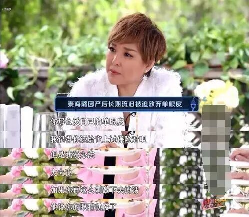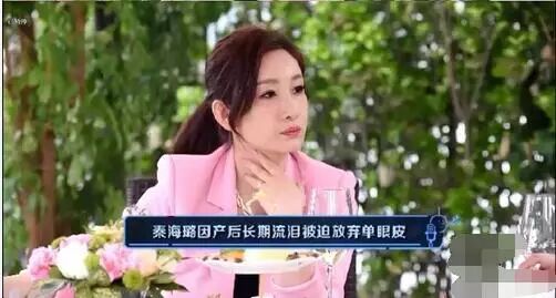 秦海璐在节目中说,因为产后长期流泪,当时眼睛发炎了,大夫说你没办法,必须得把双眼皮割了,把那个睫毛翻上去。