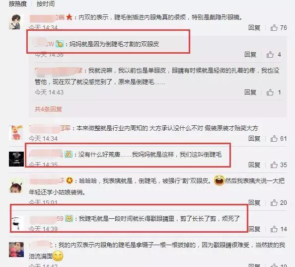 网友纷纷表示,感同身受,倒睫毛的痛一般人真不懂,当睫毛倒插进眼角真的很烦,很伤眼睛的,需要经常剪,如果等到情况很糟糕,发炎什么的,是会被“强行要求”割双眼皮的。