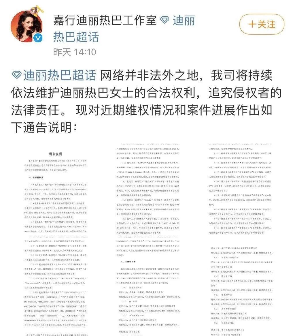 声明表示会追究相关言论发布者的法律责任,还晒出了维权告黑名单,包括爆料热巴怀孕的狗仔。