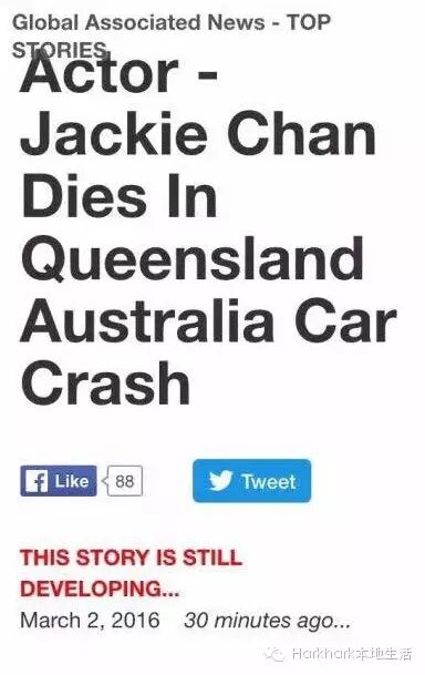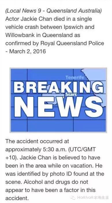 新闻称,当日5:30左右,成龙在Ipswich和Willowbank之间遭遇车祸不幸身亡,已通过ID确认其身份,并排除了酒驾毒驾的可能性。言之凿凿,连时间地点都如此精确,真是有理有据让人信服。