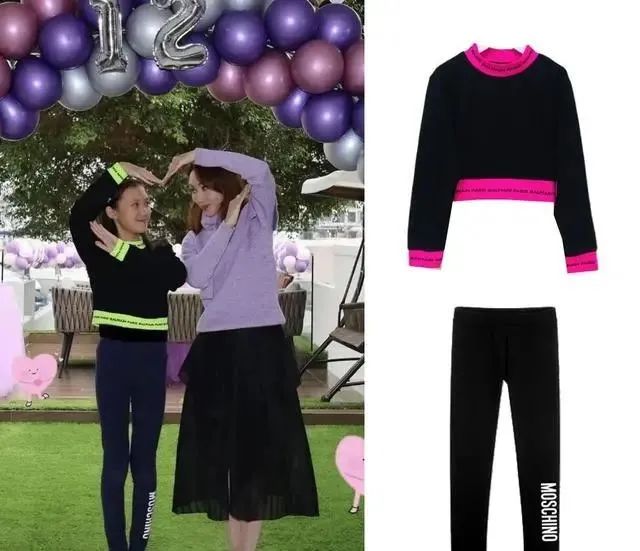 郭可盈女儿的生日穿着很时髦。选择的款式是拼接圆领外套,以黑色为主,辅以引人注目的黄色。穿在12岁女孩身上非常生动。