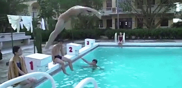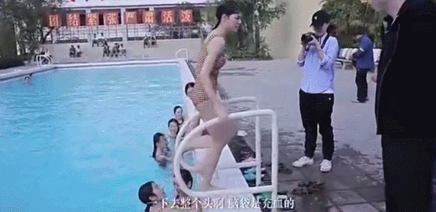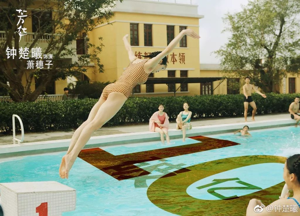 有场泳池边的戏,冯小刚见钟楚曦入水姿势好看,临时决定让她拍一个站在高台上跳水的镜头。