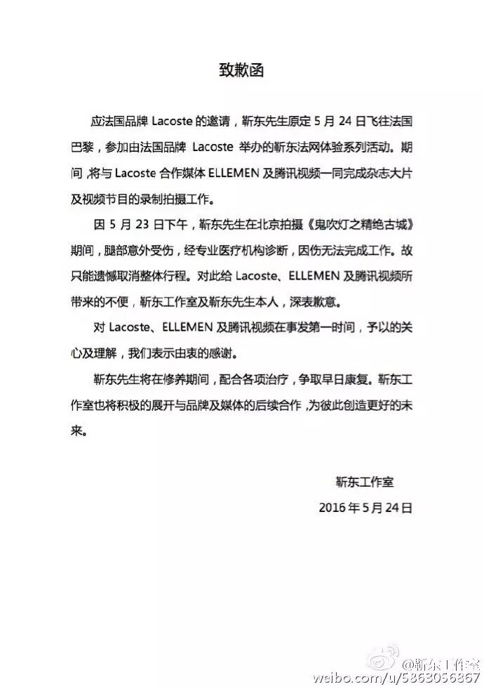 当天上午11时许,靳东工作室对外发布了致歉函。函中向因故取消的靳东法网体验系列活动主办邀请方Locoste及合作媒体ELLEMEN、腾讯视频表达了歉意,对以上三方的理解与关心诚挚道谢,并表示今后会积极开展后续合作。