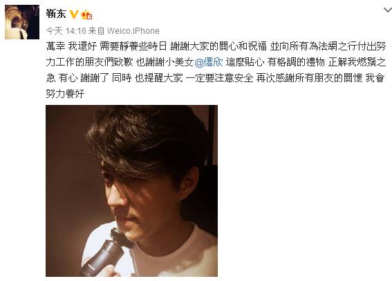随后,靳东本人也更新微博,向关注他伤势及赠送礼物的朋友致谢,告知各位朋友他还好,只是“需要静养些时日”,并向法网之行的所有工作人员致歉。他在微博中提醒大家一定要注意安全,并表示自己会努力养好身体。