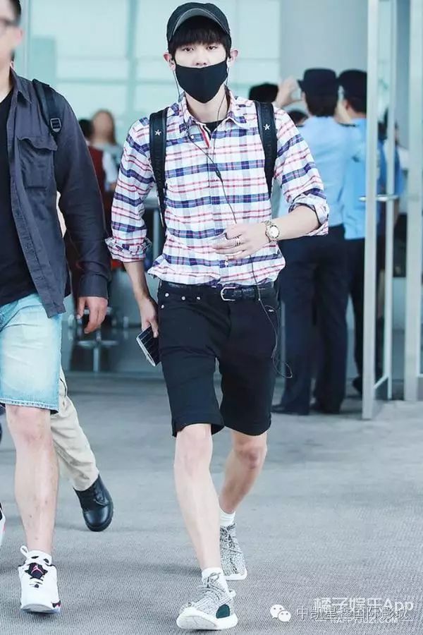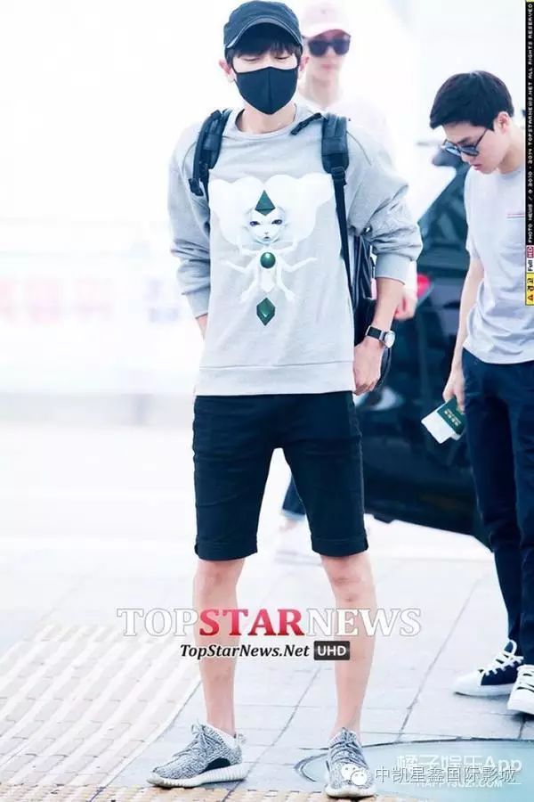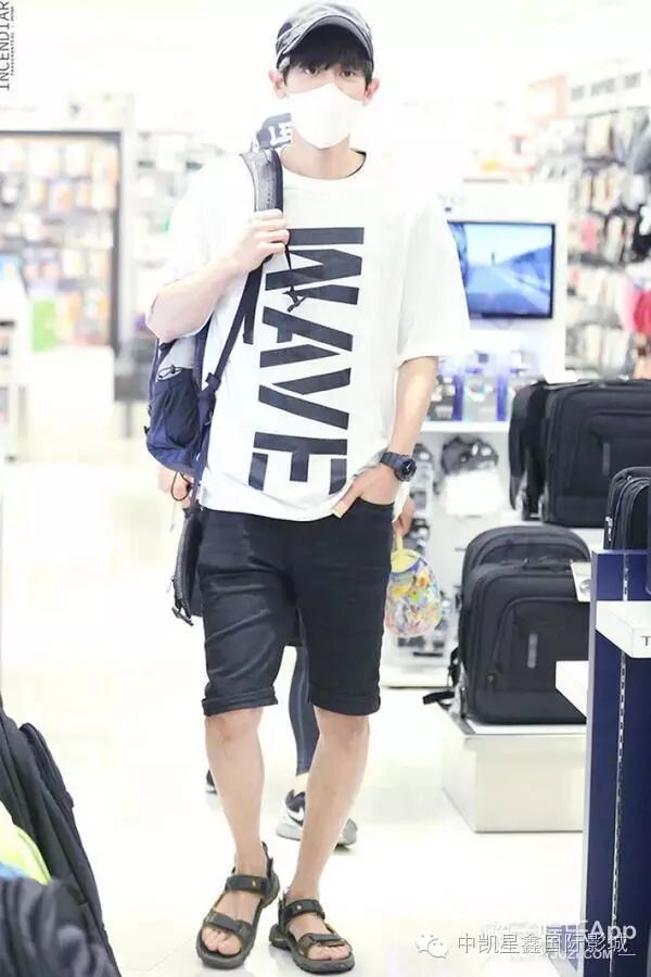字母白T搭配黑色短裤和双肩包,完全一副大学生的样子,脚上的凉鞋更是随意的很,丝毫没有高高在上的偶像包袱。