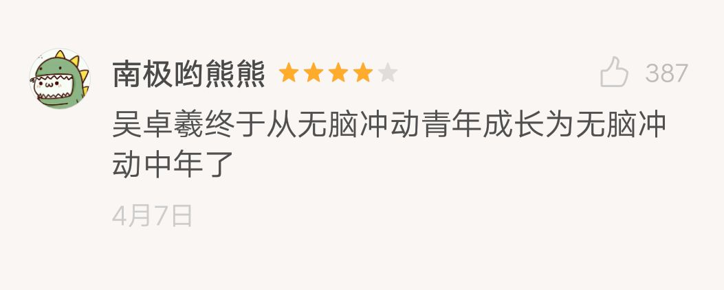 这个豆瓣评论真的是一针见血了——“吴卓羲终于从无脑冲动青年成长为无脑冲动中年了。”⬇️