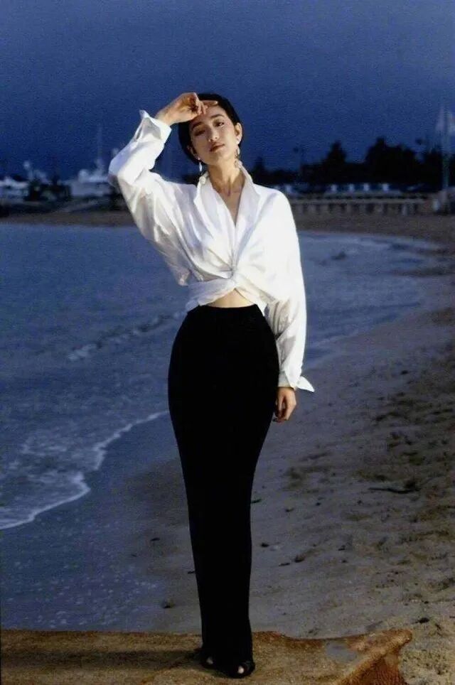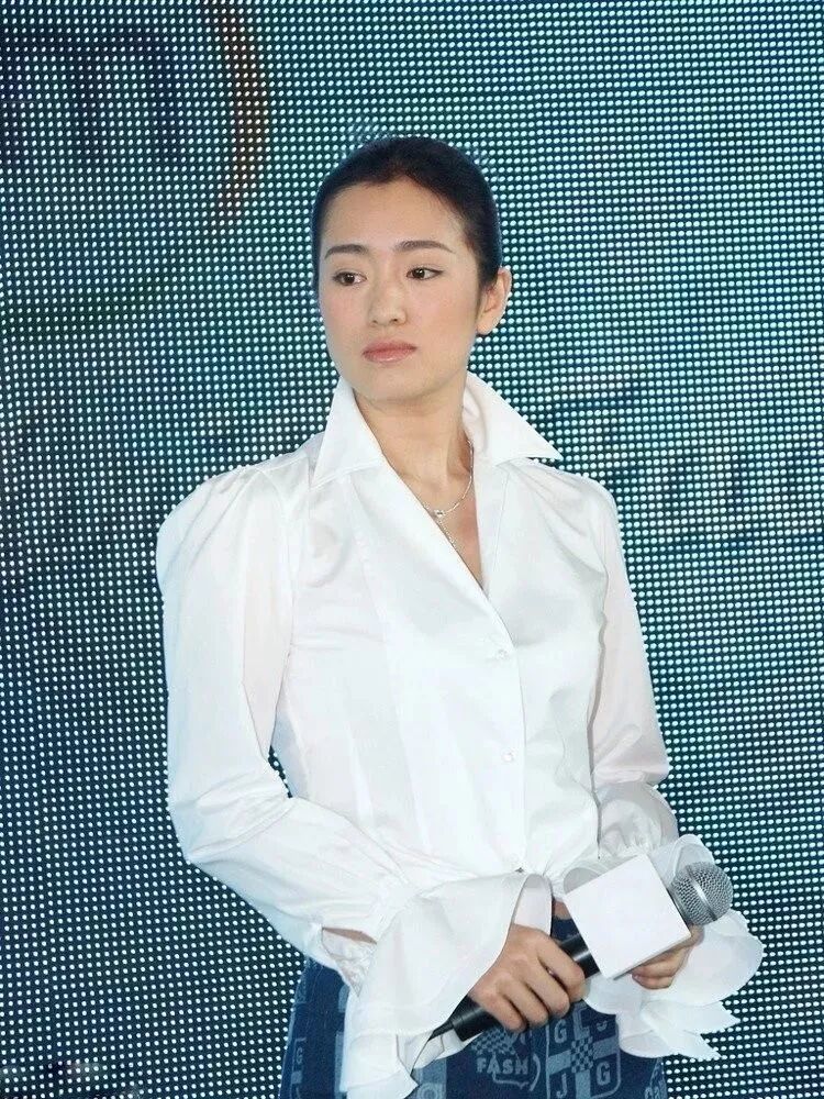 要说巩俐穿过最有代表性的单品,毫无疑问是白衬衫。