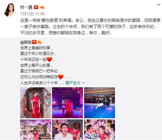 在田亮的微博日常里,除了一些工作的宣传需要外,绝大多数内容都是叶一茜和孩子。