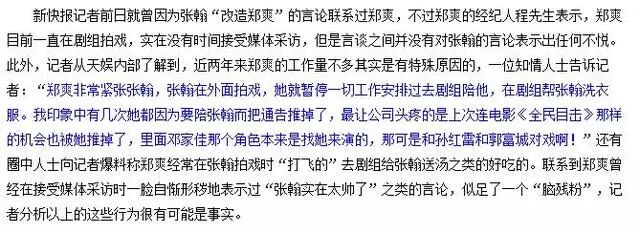 “郑爽非常紧张张翰,张翰在外面拍戏,她就暂停一切工作安排过去剧组陪他,在剧组帮张翰洗衣服。我印象中有几次她都因为要陪张翰而把通告推掉了,最让公司头疼的是上次连电影《全民目击》那样的机会也被她推掉了,里面邓家佳那个角色本来是找她来演的,那可是和孙红雷和郭富城对戏啊!”