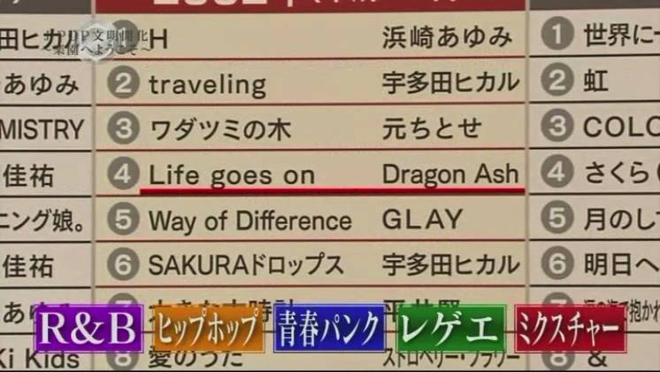 回顾这一时期的榜上单曲,宇多田光、平井坚和化学超男子主打R&B曲风;ROAD OF MAJOR、MONGOL800、175R走的是青春朋克路线;决明子的嘻哈,三木道三的雷鬼系,还有摇滚中融合了说唱的风格的Dragon Ash…各种不同风格的音乐百花齐放,“必须要成为畅销作品”的咒语已被解开。换句话说,允许歌手们自由表现,畅所欲唱的时代的来临,才是J-POP文明开化的真正内涵。