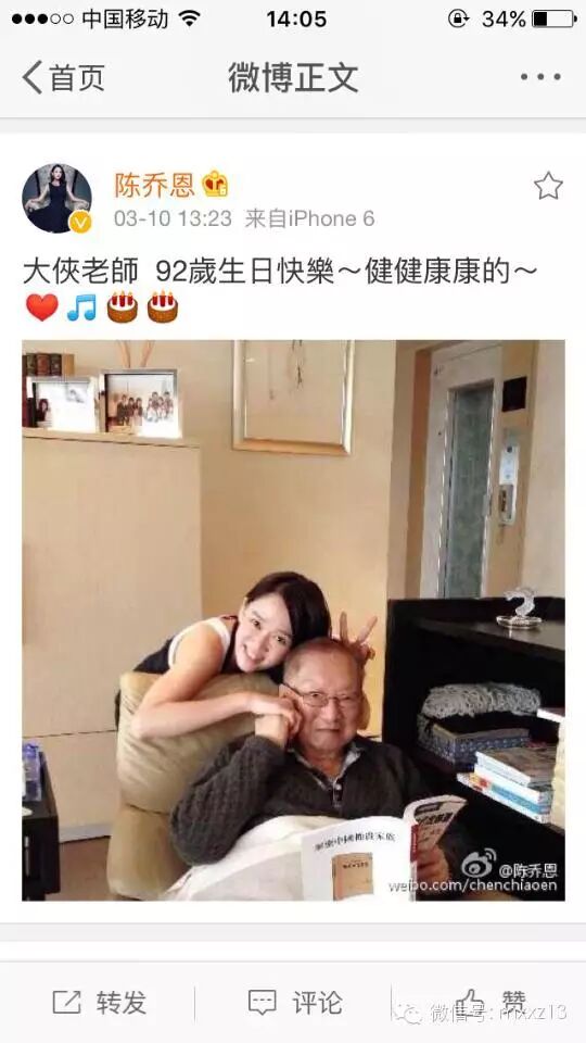 昨天,金庸老先生生日,陈乔恩霍建华两人献上祝福