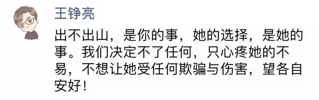 很快张靓颖的好朋友王铮亮发文称:“出不出山是你的事,她的选择是她的事。我们做不了任何,只心疼她的不易。”