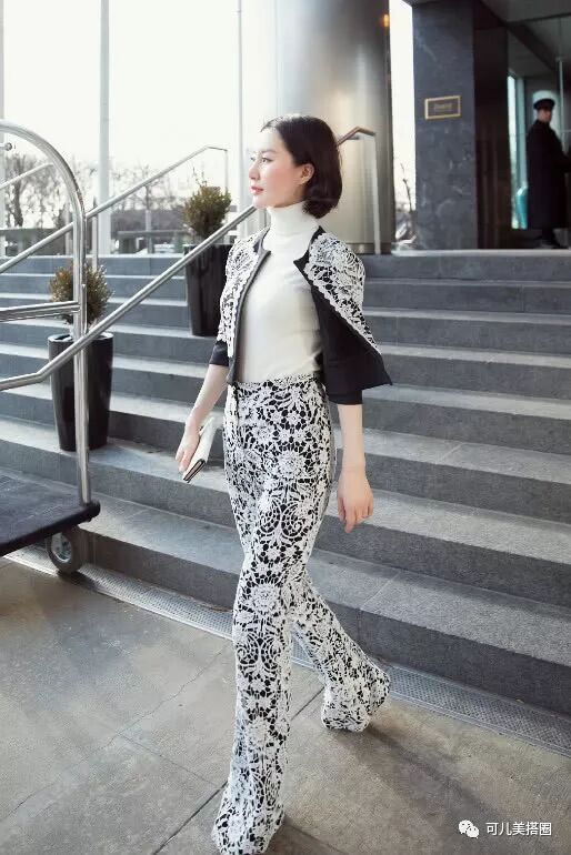 最后再看看这一张,气场一米八有没有。白色的高领毛衣作为内搭,外面是一条黑白印花的套装,很时尚也很休闲。很修身的一套衣服,看起来身材非常的好。高腰的裤子更是显得腿部更加笔直修长,整个人看上去气场非常的强,短发的感觉看起来更加干练,也显得身材比例更加协调。这样的舒畅,看起来很高挑时尚,浑身上下透着一股知性美,很有女人味!