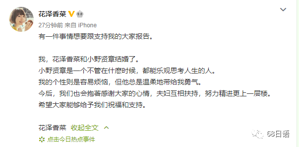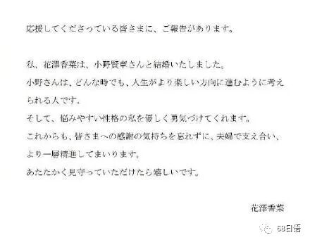 同时,花泽香菜和小野贤章在其他社交平台也均发布了结婚的喜讯。