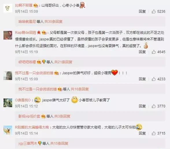 可是网友不干了,都心疼死jasper了。明明这么乖个娃娃结果被陈小春凶了一天,纷纷跑到应采儿的微博下去为jasper打抱不平。