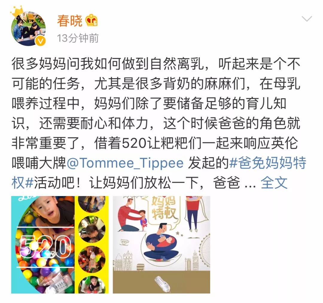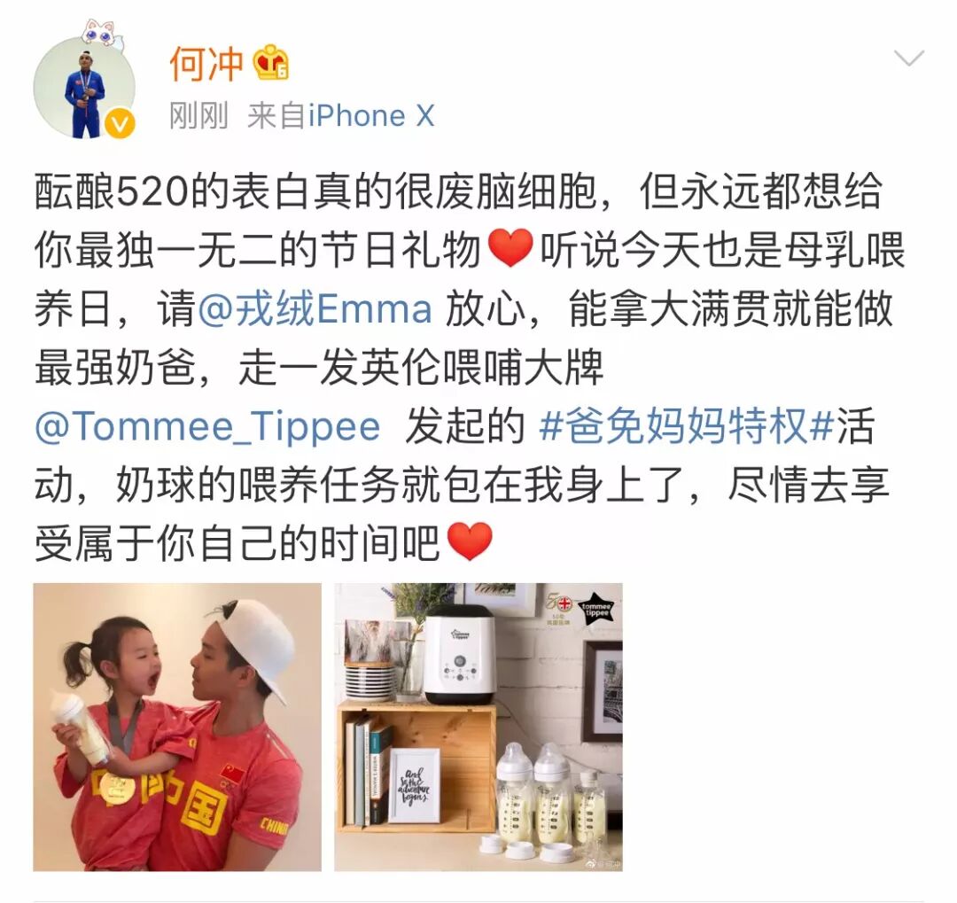 谢谢每一个为宝宝用心付出的爸爸,5月20日是世界母乳喂养日,一起支持哺乳妈妈,TommeeTippee®汤美星™携手三位明星奶爸:民谣歌手彭坦、奥运冠军何冲、国服第一狼王JY戴士,共同发起#爸免妈妈特权#公益活动,呼吁爸爸们解放妈妈双手,参与带娃中去,加入哺乳过程,感知养育的乐趣与伟大,给予哺乳期的妻子多一点体贴,也给予身边背奶妈妈多一点支持和理解。