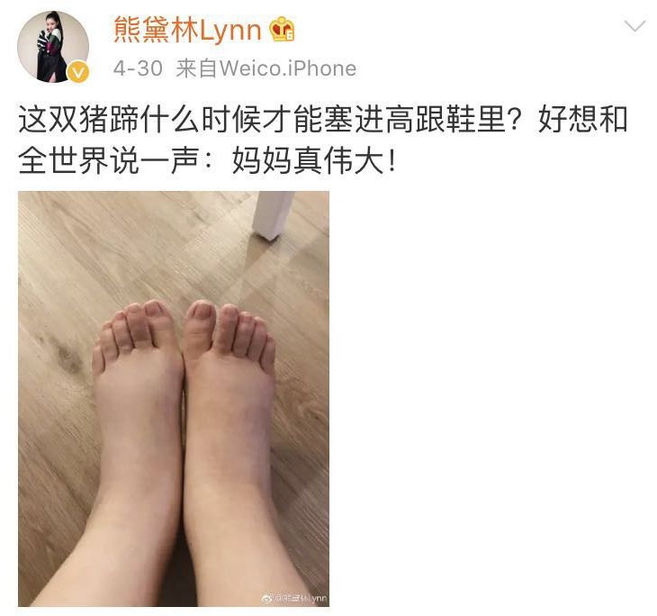 都说生孩子辛苦,即使是像熊黛林貌美这样貌美有钱的女明星,当妈妈也不是一件轻松的事情,产后双脚浮肿,她在微博晒出照片,并自黑这是一双“猪蹄”。