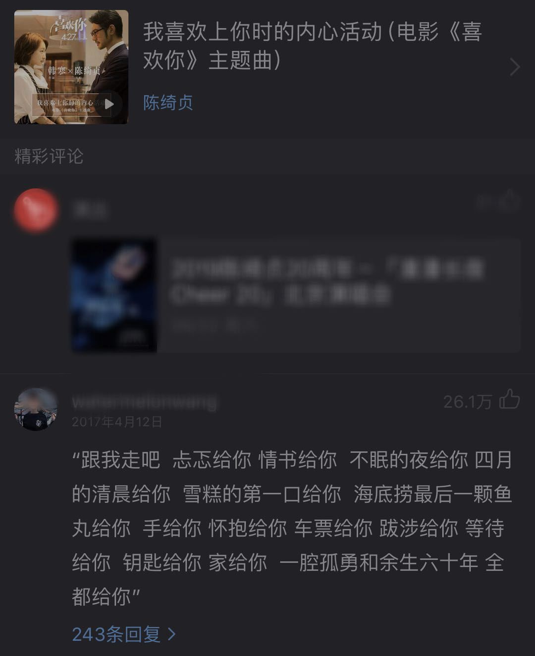 今天循环播放了这首歌,注意到许久不听,它下方留言都超过10万条了,喜欢点赞最高的那段话:你走吧,我自己可以搞定。