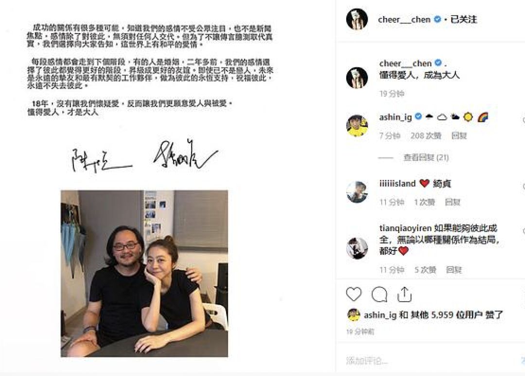 5月7日下午的时候,陈绮贞发了ins,宣布和相恋18年的钟成虎分手。