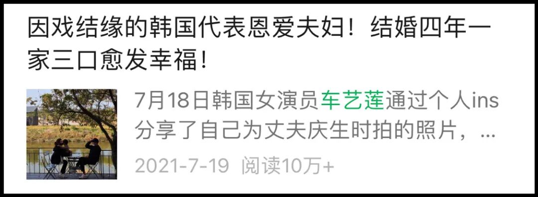 演员车艺莲和朱相昱于2015年出演MBC《华丽的诱惑》相识,随后互生好感由同事发展为恋人关系,2017年5月25日两人正式举行婚礼成为夫妻,2018年7月30日朱相昱、车艺莲喜得千金,从平时两人分享的动态也能看出,他们的三口之家非常幸福。